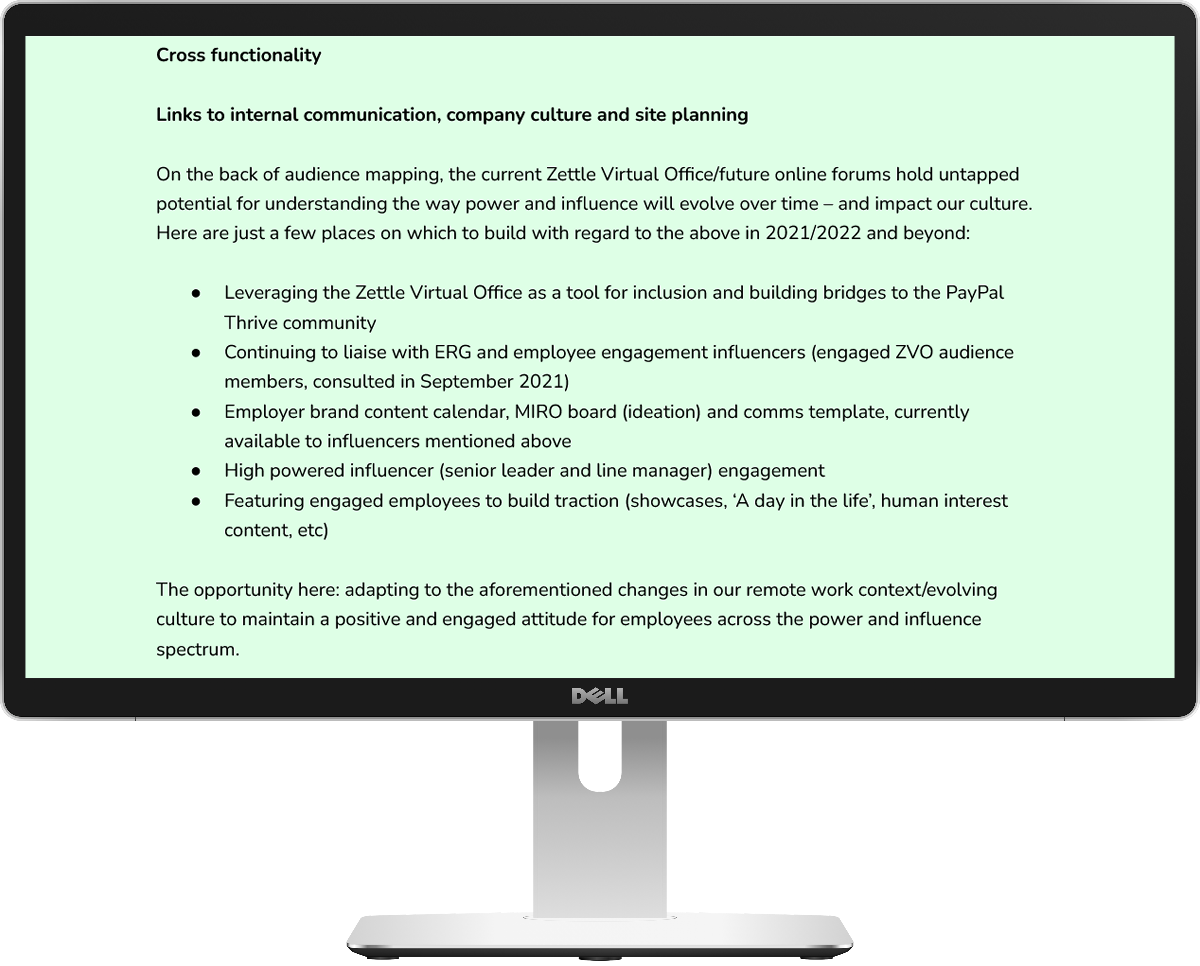 Seeing the positive effects of the Zettle Virtual Office inspired a self-initiated project – moving into 2021, I put together the Zettle Hybrid Workplace Strategy & Communication Plan. Providing some background on how remote work had become the new normal with audience mapping, the strategy established a vision, mission and purpose, addressed challenges, set goals, provided references and championed cross functionality, planning for internal communication, company culture and site (office) management going forward.