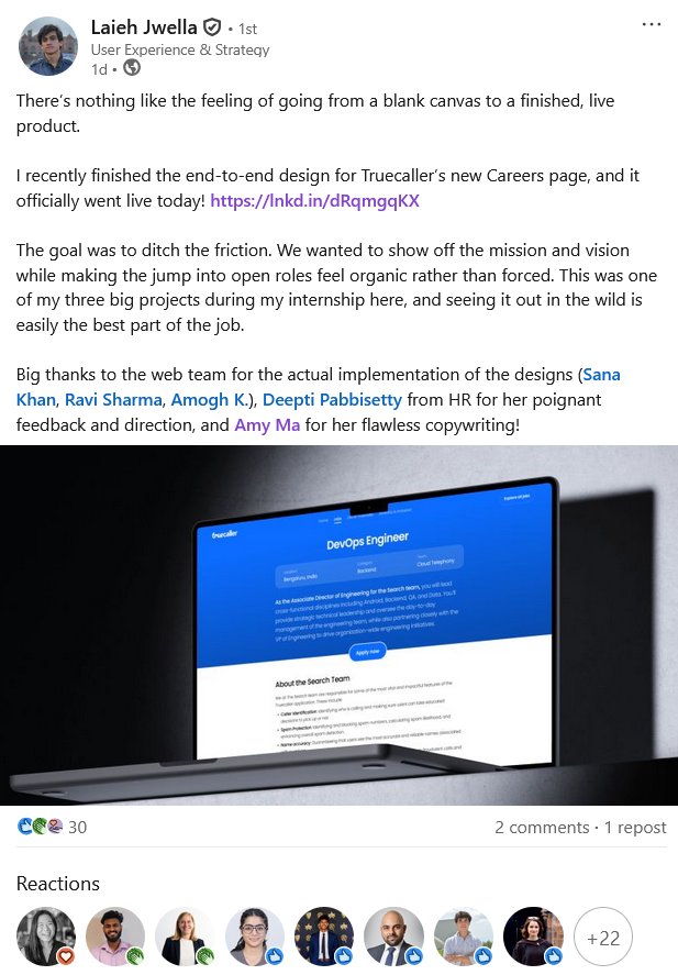 With ‘friction free’, ‘easy to digest’ and ‘personality rich’ as our watchwords, we produced end-to-end designs in Figma that captured the essence of the organisation, in close collaboration with Truecaller’s People team. These were then implemented by a stellar web team and released in February 2026.