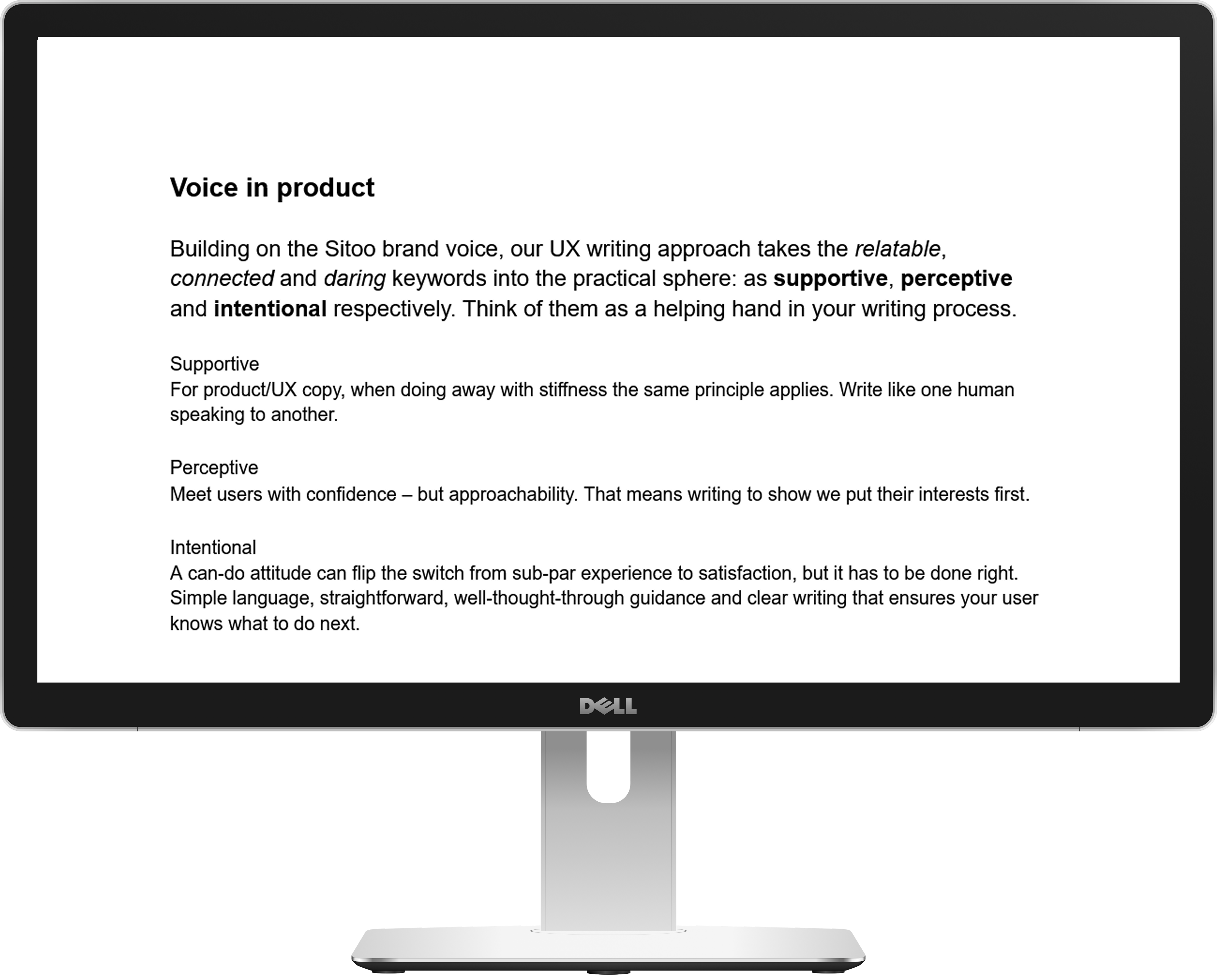 Voice, tone and brand personality (the Sitoo brand personality, brand promise, voice in brand – and how all this informs voice in product)